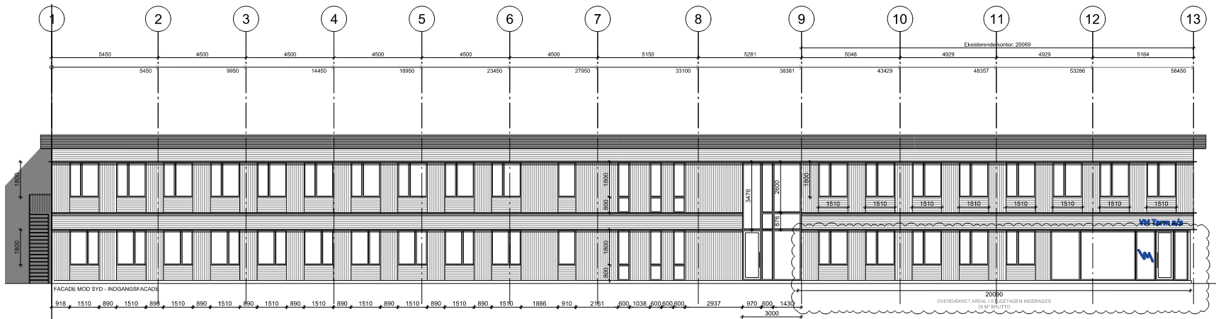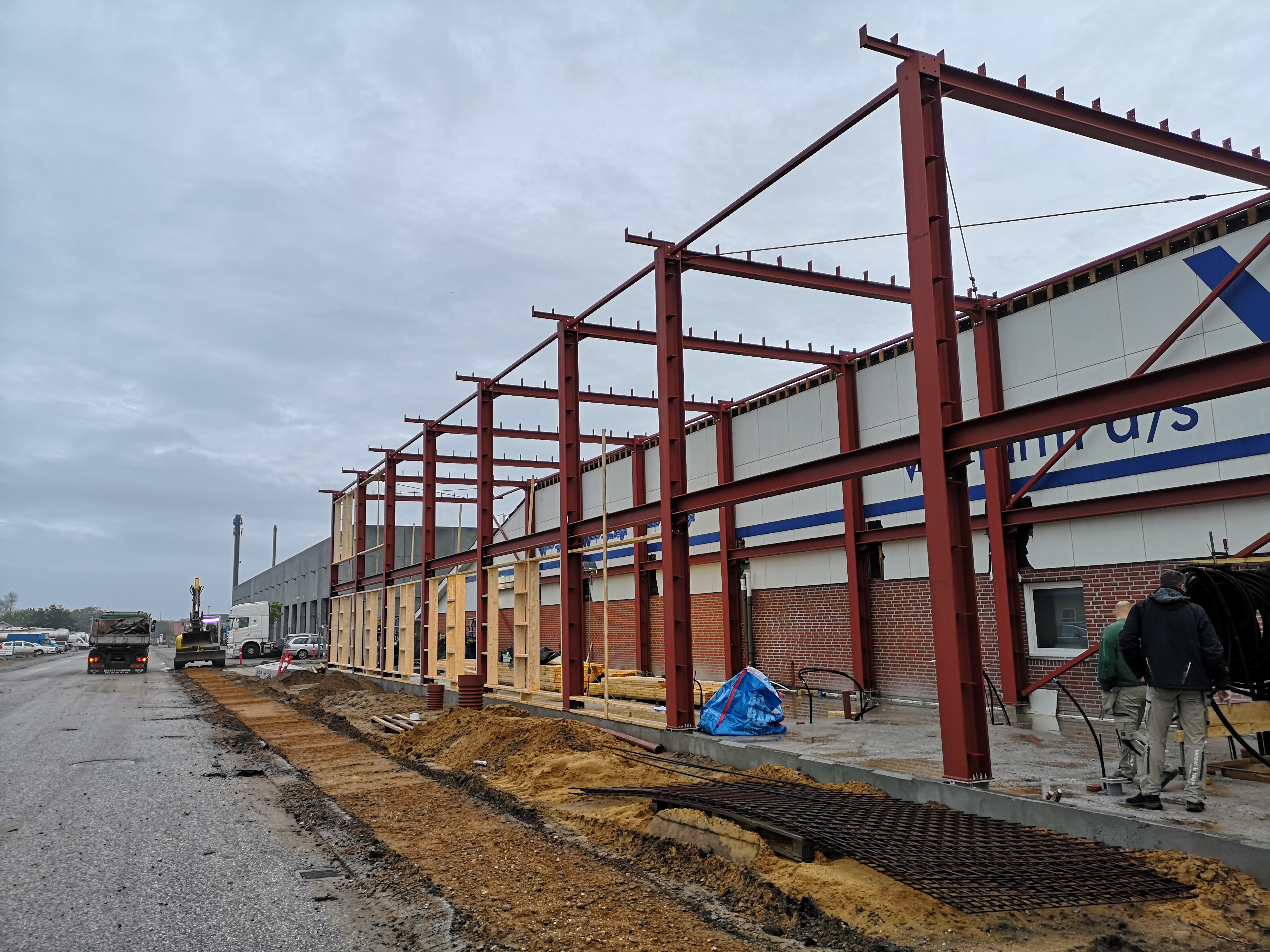 Tilbygning i to etager på 648 m² til eksisterende kontor i én etage opført i stålkonstruktioner. |